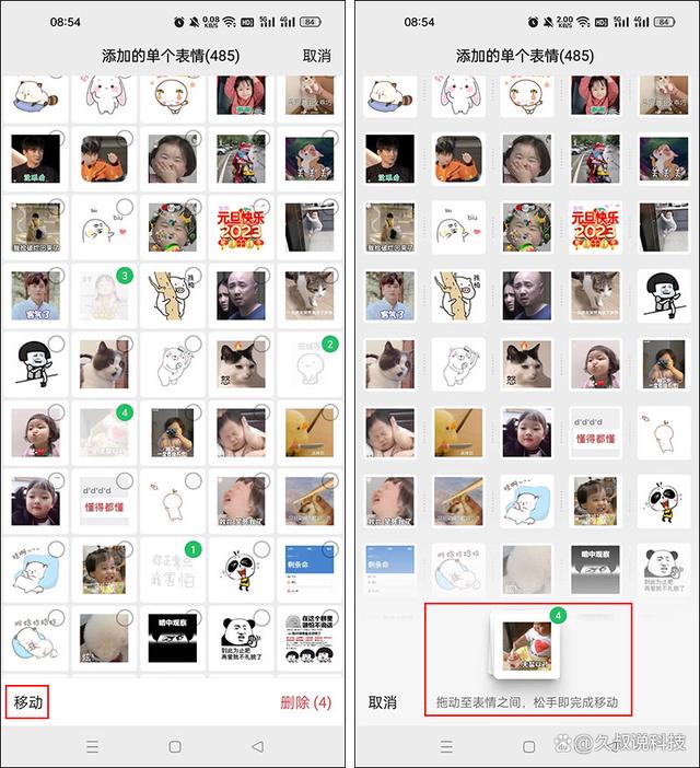 然后就可以选择想移动的表情包了,既可以选择连在一起的表情,也可以选择不连在一起的表情,想移动哪几个就选择哪几个,选择好后,点击左下角的【移动】,就可以将这些表情包批量移动到你想移动的位置啦。