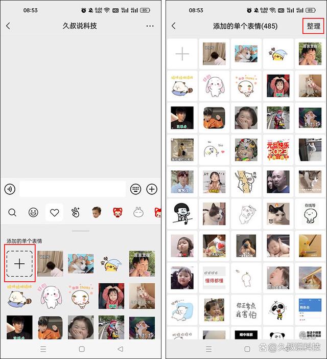 这个表情库我们和微信好友聊天时,看到喜欢的表情会不断的添进来,所以慢慢的一些常用表情都跑到后面去了,于是用起来就不太方便了。安卓这次8.0.35版带来的功能普及中,表情的批量移动功能大多数用户都可以用了,这样我们就可以批量把常用的表情往前移,或者很少用了的表情批量往后移了。具体的操作是,点击表情库排在第一的那个大大的【+】,进入表情库的管理界面,再选择右上角的【整理】。
