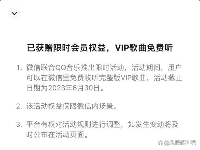 为了配合这次微信音乐功能的大更新,微信和QQ音乐一起整了个活动,活动期间,用户在微信里可以免费听QQ音乐中完整版的VIP歌曲!也因此,“微信可免费听周杰伦”的话题直接冲上了热搜,虽说这个活动是有时间限制的,截止时间是2023年6月30日,但也很快乐。