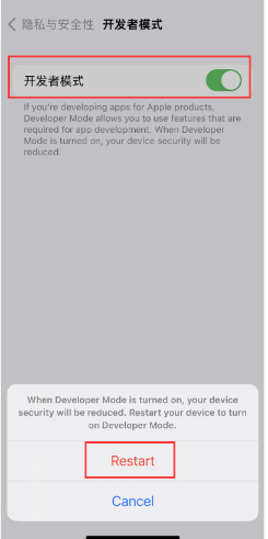 设备重新启动并解锁后,还会显示一条警报,确认要启用开发者模式,然后点击打开,并在出现提示时输入设备密码。