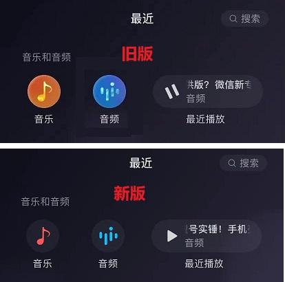 在最新内测版中,在微信主页聊天页面下拉,顶部的“音乐”和“音频”图标进行了优化,其实这个也是最近热更新中的的新变化。
